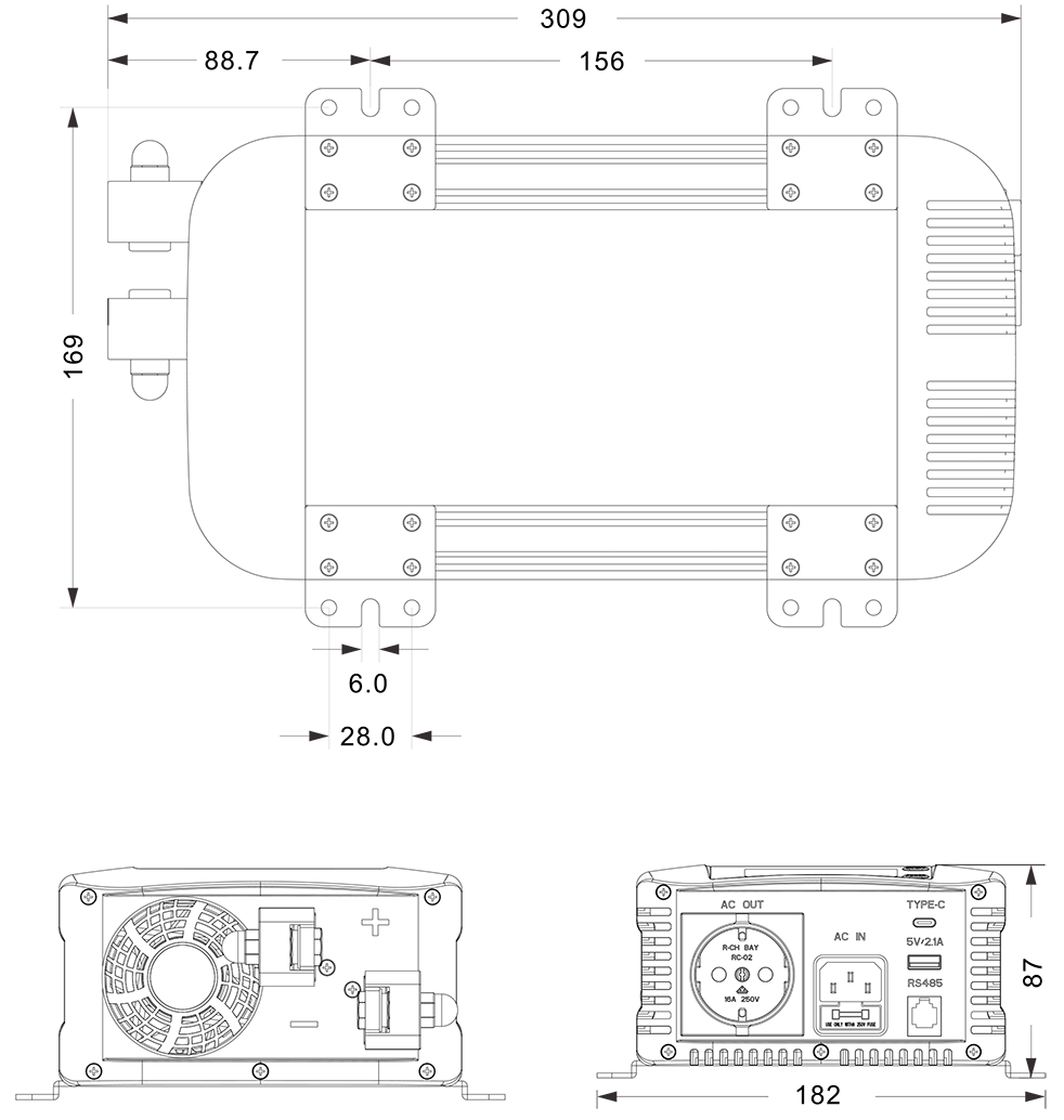 Převodový spínač Standardní ATS: Střídač do sítě AC: 8~10 ms.;Utility AC do měniče: 16 ~ 25 ms.